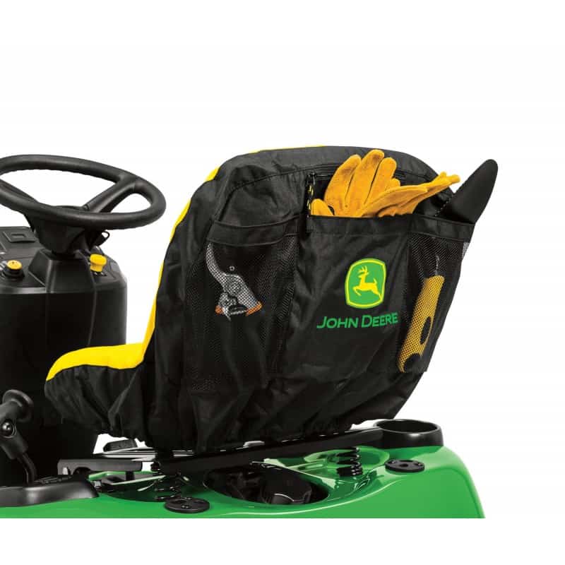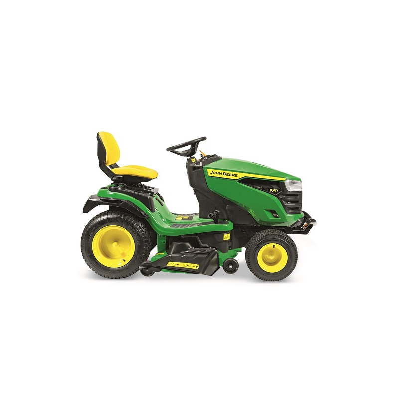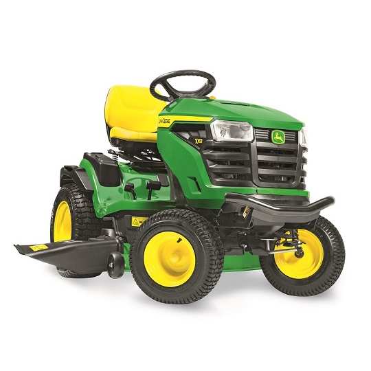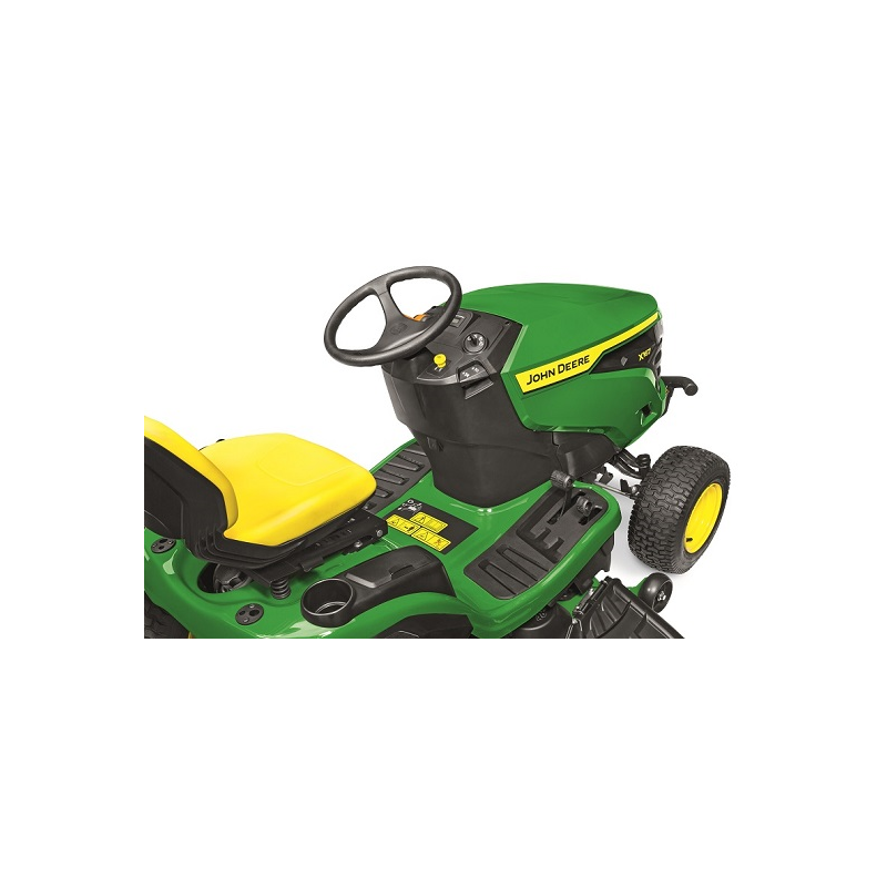 Confort d’utilisation :Transmission hydrostatique avec pédales juxtaposéesLevier de hauteur de coupe ergonomiquePlancher antidérapantSiège Premium réglable sur 14 cm avec dossier de 38 cmPneumatiques AV : 15×6-6; AR : 20×8.0-8Réservoir de carburant de grande capacité : 9,1 LCoffre de rangement avec couvercleJauge d’essence au tableau de bordFiltre Eazy changeEngagement électrique du carterElargisseurs d’aile arrièrePare-chocs avantRégulateur de vitesseQualité du carter de coupe :Carter de coupe 3 en 1 (Bouchon mulching de série)Carter en acier embouti calibre 13 (2,3 mm)Profondeur du carter : 10 cm2 roues de jaugeRaccord de lavage du carterPerformance du moteur :Moteur Briggs & Stratton® 15 kW avec système ReadyStartAccès facile au filtre à air, à la batterie, au réservoir d’huile et au bouchon de vidangeFiabilité et durabilité :Châssis intégral en acier de 2,7 mm sur toute la longueurEssieu avant en fonte avec fusées de direction de grand diamètreQualité de fabrication 100% John DeereGarantie constructeur 3 ansFiche techniqueMarque moteurBriggs & StrattonType moteurBicylindre essenceCylindrée724 cm³, bicylindre en « V », OHVPuissance moteur24,0 chPuissance nominale17,6 kW à 3150 tr/minLargeur de coupe122 cmRéglage hauteur de coupe25 – 101 mmCarterAcierAvancementHydrostatiqueBac de ramassageEn optionMulchingDe sériePoids241 kgGarantie3 ans